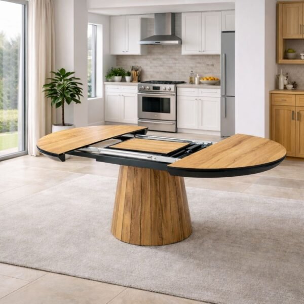 פינת האוכל JAZZ מציעה שילוב מדויק בין עיצוב עגול אלגנטי לפונקציונליות מתקדמת. משטח השולחן בגוון אלון טבעי יוצר מראה חמים ונעים, ומשתלב בצורה מושלמת עם בסיס מרכזי יציב, המאפשר נוחות ישיבה מרבית מכל כיוון. השולחן נפתח בקלות באמצעות מנגנון פתיחה חכם, והופך משולחן קומפקטי ליומיומי לפינת אוכל מרווחת המתאימה לאירוח משפחתי וחברתי, תוך שמירה על מראה אחיד ומאוזן גם במצב פתוח.