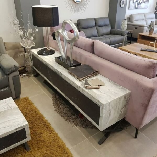 הדגם מגיע בגימור דמוי שיש בגווני אפור־לבן, המעניק תחושת עומק ויוקרה, יחד עם חזיתות כהות היוצרות ניגוד מודרני ויוקרתי.