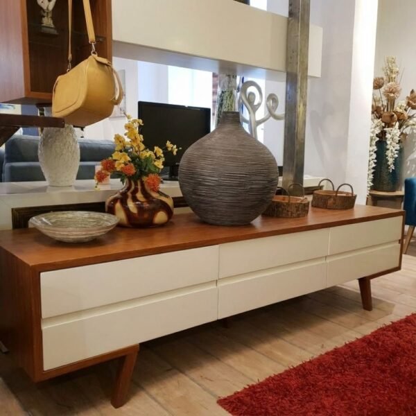המזנון משלב גימור עץ חם בגוון טבעי עם חזיתות לבנות חלקות, היוצרות מראה מודרני, בהיר ורענן. הקווים הישרים והעיצוב המינימליסטי מעניקים לרהיט אסתטיקה על־זמנית שמתאימה לכל חלל סלון.