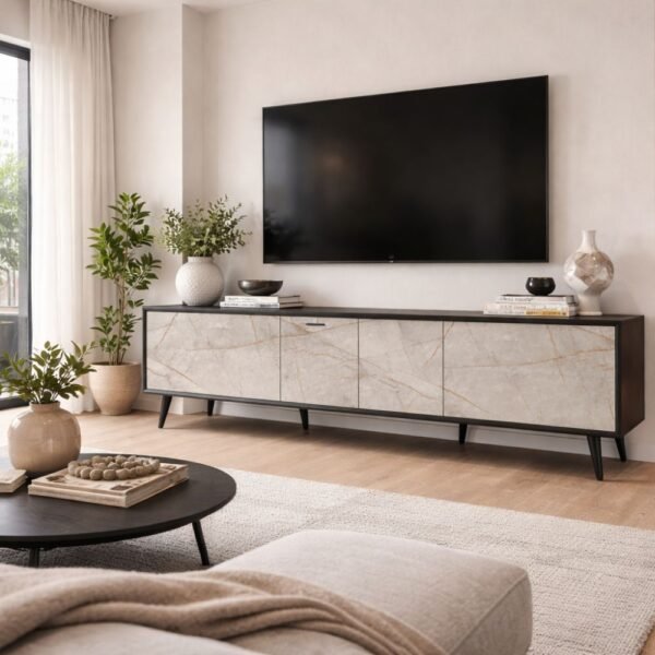 שידת הטלוויזיה הזו מביאה שילוב מדויק בין עיצוב מודרני לנוחות יומיומית, ומשתלבת באופן טבעי בדירה עירונית מוארת ונעימה. הגימור דמוי השיש בגוון בהיר עם נגיעות עדינות מעניק תחושת יוקרה רגועה, בעוד שהמסגרת הכהה מוסיפה עומק ונוכחות לחלל. לצד הצמחייה, הטקסטיל והאביזרים שמסביב, היא יוצרת פינה חמה ומזמינה שמרגישה אמיתית וחיה. מעבר למראה המרשים, היא מציעה פתרון אחסון פרקטי ונוח, כך שתוכלו לשמור על סדר וסטייל – בלי להתפשר על פונקציונליות.