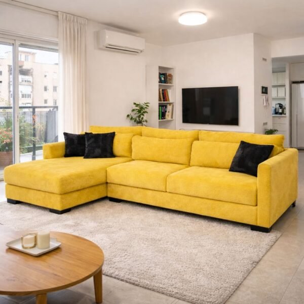 ספת YUVAL היא ספה פינתית רחבה עם ישיבה עמוקה ונעימה, המתאימה לסלון משפחתי ולחללים עירוניים. ריפוד בד איכותי בגוון חרדל מעניק נוכחות חמימה ושמחה, לצד כריות גב רכות התומכות בנוחות יומיומית. המבנה המאוזן והעיצוב הנקי יוצרים שילוב מושלם בין פרקטיות למראה מודרני.